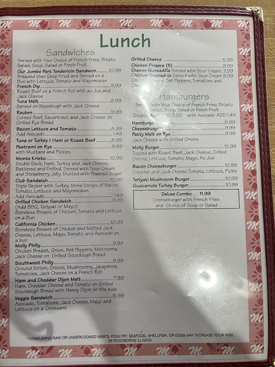 For those craving something unique, the Southwest-inspired Breakfast Burrito, packed with scrambled eggs, ham, and complementary toppings, is a must-try. Customers consistently praise the generous portions and warm, friendly service, highlighting the cafe's ability to create a homely feel that encourages memorable dining experiences. Enjoy classic comforts at Molly Brown's, where each dish brings a little taste of home to your plate.